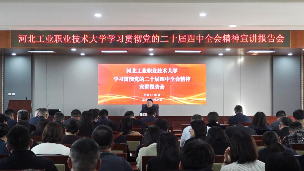 11月24日下午,我校在红旗校区办公楼五楼报告厅举行学习贯彻党的二十届四中全会精神宣讲报告会,党委书记李鑫作专题宣讲,国产一区二区在线视频领导班子成员 国产精品一级,党委委员,纪委委员,全体中层干部,基层党组织书记,政协委员和民主党派代表,新入职教师和学生代表参加报告会。